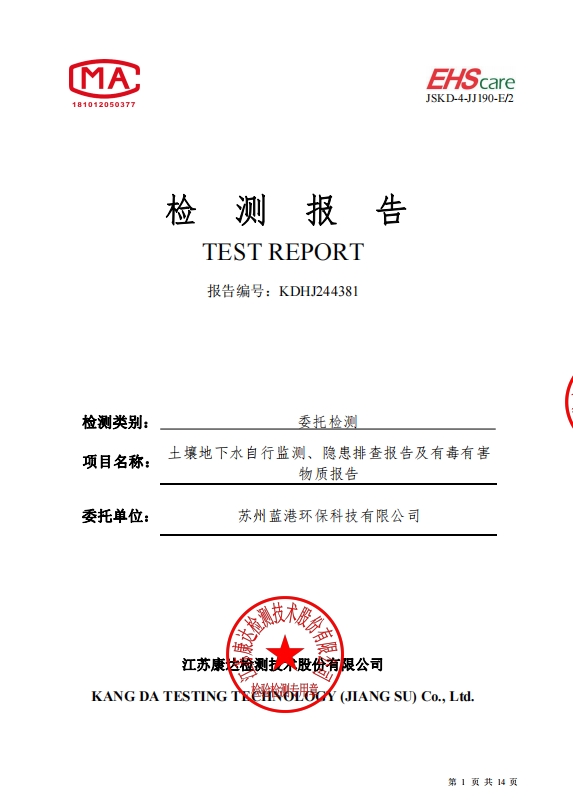 蘇州藍港環保科技有限公司檢測報告已公示,詳情請查...